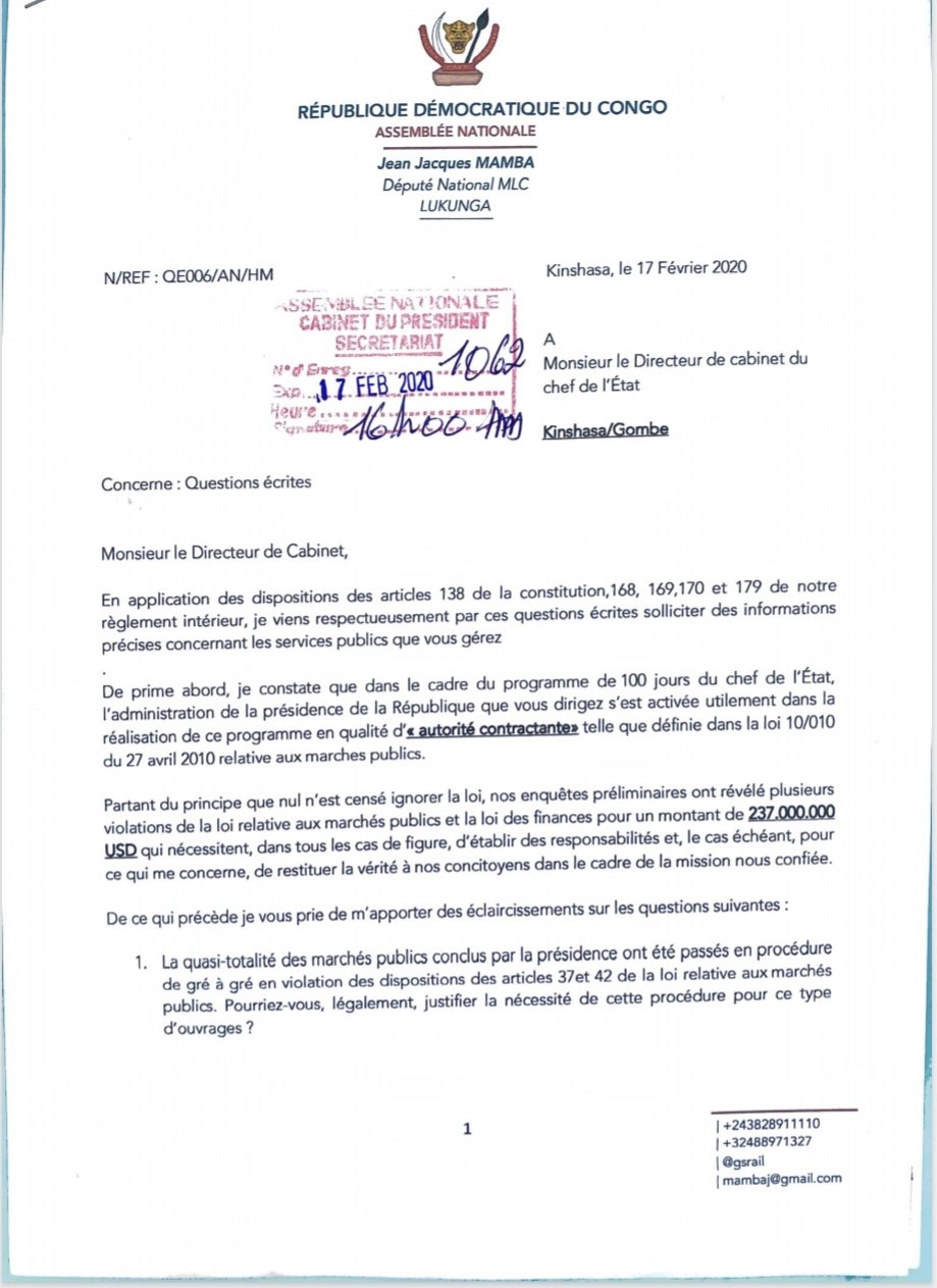 Cadre et élu du parti Mouvement de libération du Congo, (MLC), de Jean-Pierre Bemba, le député Jean-Jacques Mamba, en référence aux articles 138 de la constitution congolaise ainsi qu'aux 168, 169, 170 et 179 du Règlement intérieur de l'Assemblée nationale, a saisi le directeur de cabinet du chef de l'État par rapport à la gestion des marchés et services publics de l'État.