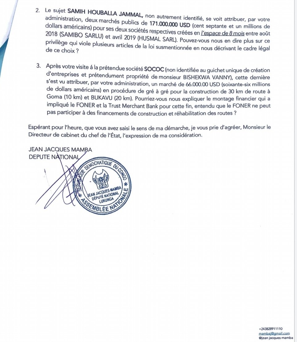 Aussi, veut-il, des explications par rapport au privilège accordé à monsieur Samih Houballa Jammal à qui a été attribué 2 marchés publics de 171 millions de dollars pour ses 2 sociétés respectives créées en l'espace de 8 mois, entre août 2018 et avril 2019.