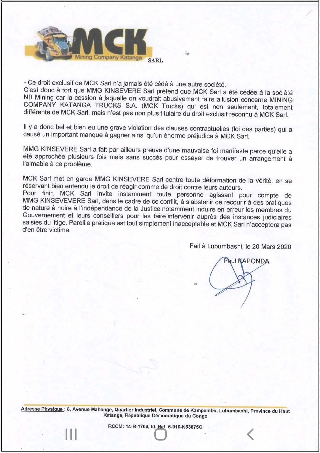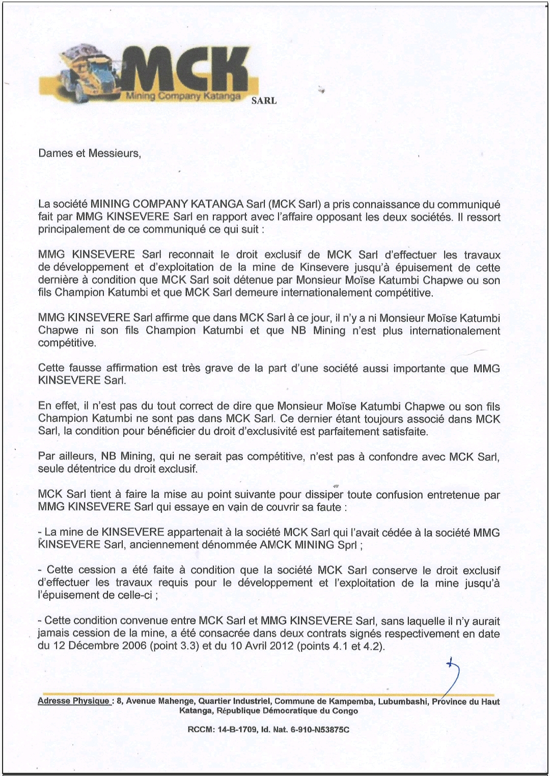 C'est une réplique aux allégations malicieusement propagées dans l'opinion par MMG Kinsevere dans le dénaturer la vérité, que MCK SARL a rendu publique sa version des faits.